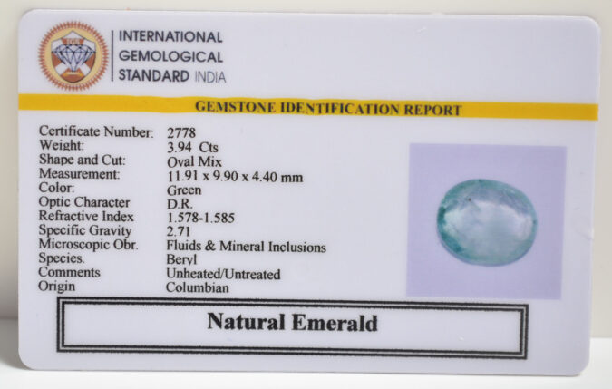 Beautiful 3.94 Cts Natural Emerald (AAA-Mines) sva 4+ Ratti EMERALD. Free Horoscope & Free Pundit Ji Astrological Advise / Consultation. Original Natural Lab certified gems by IGI GTL / Birth stones / Large Gem Selection of shree shubh Rashi Ratan Vedic dhan at Gem Mines. May Bhagwan Brahma, Vishnu, Shiv & Universe bless you.