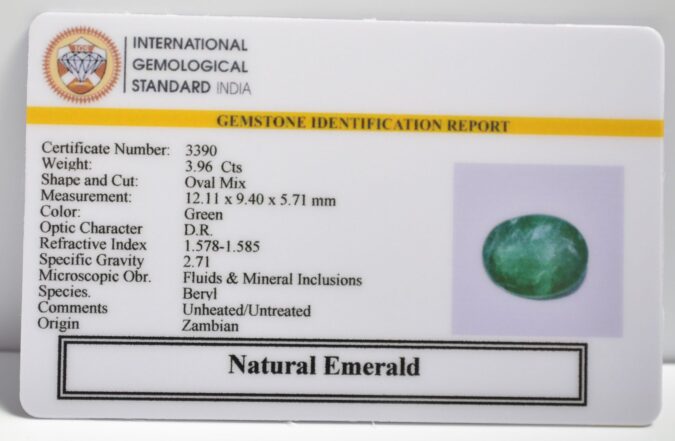 Beautiful 3.96 Cts Natural Emerald (AAA+-Mines) sva 4+ Ratti EMERALD. Free Horoscope & Free Pundit Ji Astrological Advise / Consultation. Original Natural Lab certified gems by IGI GTL / Birth stones / Large Gem Selection of shree shubh Rashi Ratan Vedic dhan at Gem Mines. May Bhagwan Brahma, Vishnu, Shiv & Universe bless you.