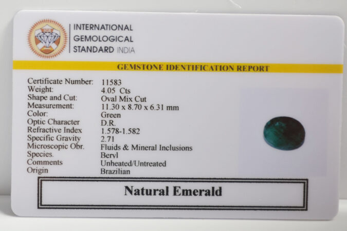 Beautiful 4.05 Cts Natural Emerald (Good-Mines) sva 4+ Ratti EMERALD. Free Horoscope & Free Pundit Ji Astrological Advise / Consultation. Original Natural Lab certified gems by IGI GTL / Birth stones / Large Gem Selection of shree shubh Rashi Ratan Vedic dhan at Gem Mines. May Bhagwan Brahma, Vishnu, Shiv & Universe bless you.