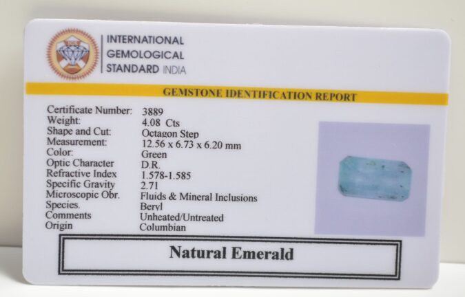 Beautiful 4.08 Cts Natural Emerald (Very Good-Mines) sva 4+ Ratti EMERALD. Free Horoscope & Free Pundit Ji Astrological Advise / Consultation. Original Natural Lab certified gems by IGI GTL / Birth stones / Large Gem Selection of shree shubh Rashi Ratan Vedic dhan at Gem Mines. May Bhagwan Brahma, Vishnu, Shiv & Universe bless you.