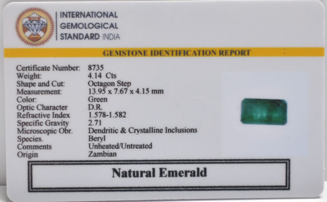 Beautiful 4.14 Cts Natural Emerald (AAA+-Mines) sva 4+ Ratti EMERALD. Free Horoscope & Free Pundit Ji Astrological Advise / Consultation. Original Natural Lab certified gems by IGI GTL / Birth stones / Large Gem Selection of shree shubh Rashi Ratan Vedic dhan at Gem Mines. May Bhagwan Brahma, Vishnu, Shiv & Universe bless you.