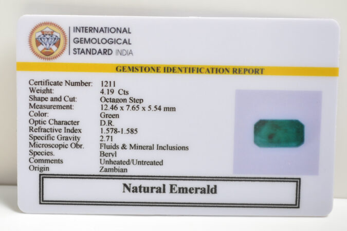 Beautiful 4.19 Cts Natural Emerald (Top-Mines) sva 4 Ratti EMERALD. Free Horoscope & Free Pundit Ji Astrological Advise / Consultation. Original Natural Lab certified gems by IGI GTL / Birth stones / Large Gem Selection of shree shubh Rashi Ratan Vedic dhan at Gem Mines. May Bhagwan Brahma, Vishnu, Shiv & Universe bless you.