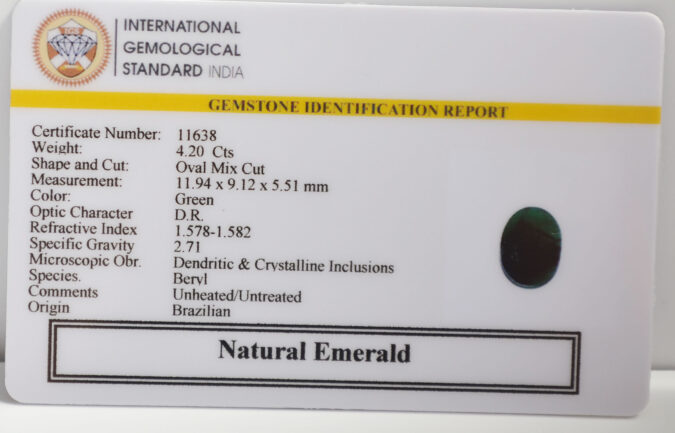 Beautiful 4.2 Cts Natural Emerald (AAA-Mines) sva 4+ Ratti EMERALD. Free Horoscope & Free Pundit Ji Astrological Advise / Consultation. Original Natural Lab certified gems by IGI GTL / Birth stones / Large Gem Selection of shree shubh Rashi Ratan Vedic dhan at Gem Mines. May Bhagwan Brahma, Vishnu, Shiv & Universe bless you.