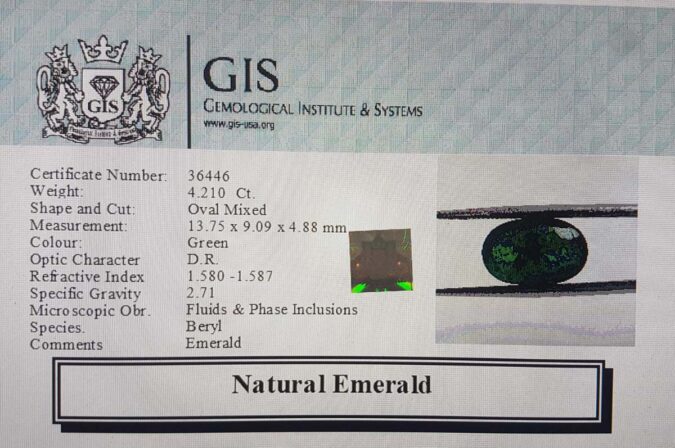 Beautiful 4.21 Ct. Emerald (Emerald Mines) Sava 4 Ratti Panna. Free Horoscope & Free Pundit Ji Advise / Consultation. Original Natural Lab certified gems by IGI GTL / Birth stones / Large Gem Selection of shree shubh Rashi Ratan Vedic dhan at Gem Mines. May Bhagwan Brahma, Vishnu, Shiv & Universe bless you.