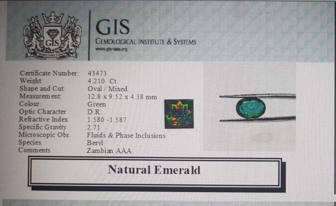 Beautiful 4.21 Ct. Emerald (Zambian Mines) Sava 4 Ratti Panna. Free Horoscope & Free Pundit Ji Advise / Consultation. Original Natural Lab certified gems by IGI GTL / Birth stones / Large Gem Selection of shree shubh Rashi Ratan Vedic dhan at Gem Mines. May Bhagwan Brahma, Vishnu, Shiv & Universe bless you.