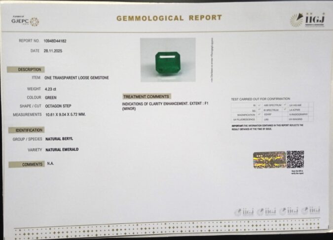 Beautiful 4.23 Cts Natural Emerald (Top-Mines) sva 4+ Ratti EMERALD. Free Horoscope & Free Pundit Ji Astrological Advise / Consultation. Original Natural Lab certified gems by IGI GTL / Birth stones / Large Gem Selection of shree shubh Rashi Ratan Vedic dhan at Gem Mines. May Bhagwan Brahma, Vishnu, Shiv & Universe bless you.