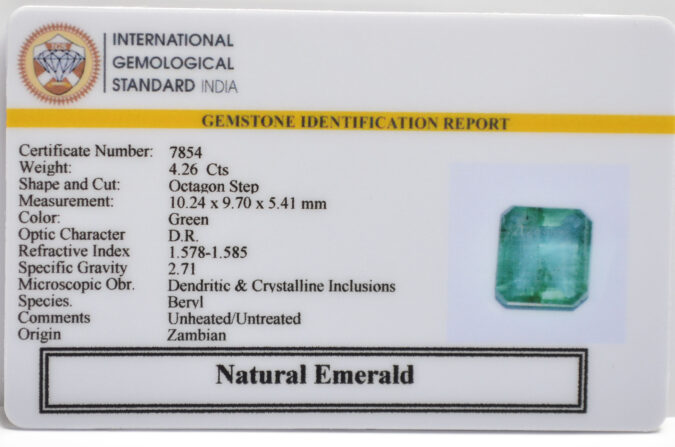 Beautiful 4.26 Cts Natural Emerald (Top+-Mines) sva 4+ Ratti EMERALD. Free Horoscope & Free Pundit Ji Astrological Advise / Consultation. Original Natural Lab certified gems by IGI GTL / Birth stones / Large Gem Selection of shree shubh Rashi Ratan Vedic dhan at Gem Mines. May Bhagwan Brahma, Vishnu, Shiv & Universe bless you.