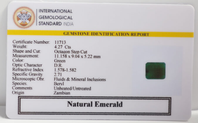 Beautiful 4.27 Cts Natural Emerald (AAA-Mines) sva 4+ Ratti EMERALD. Free Horoscope & Free Pundit Ji Astrological Advise / Consultation. Original Natural Lab certified gems by IGI GTL / Birth stones / Large Gem Selection of shree shubh Rashi Ratan Vedic dhan at Gem Mines. May Bhagwan Brahma, Vishnu, Shiv & Universe bless you.