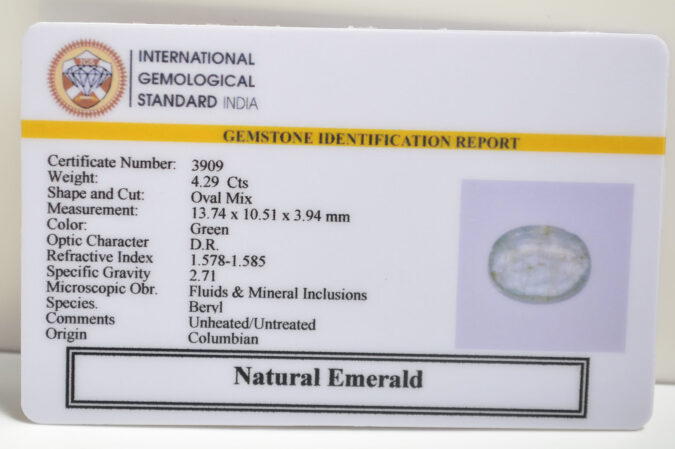 Beautiful 4.29 Cts Natural Emerald (AAA-Mines) sva 4+ Ratti EMERALD. Free Horoscope & Free Pundit Ji Astrological Advise / Consultation. Original Natural Lab certified gems by IGI GTL / Birth stones / Large Gem Selection of shree shubh Rashi Ratan Vedic dhan at Gem Mines. May Bhagwan Brahma, Vishnu, Shiv & Universe bless you.