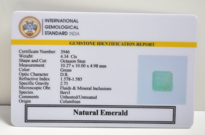 Beautiful 4.34 Cts Natural Emerald (AAA-Mines) sva 4+ Ratti EMERALD. Free Horoscope & Free Pundit Ji Astrological Advise / Consultation. Original Natural Lab certified gems by IGI GTL / Birth stones / Large Gem Selection of shree shubh Rashi Ratan Vedic dhan at Gem Mines. May Bhagwan Brahma, Vishnu, Shiv & Universe bless you.