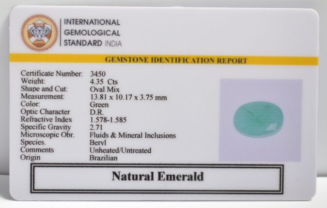 Beautiful 4.35 Cts Natural Emerald (Very Good-Mines) sva 4+ Ratti EMERALD. Free Horoscope & Free Pundit Ji Astrological Advise / Consultation. Original Natural Lab certified gems by IGI GTL / Birth stones / Large Gem Selection of shree shubh Rashi Ratan Vedic dhan at Gem Mines. May Bhagwan Brahma, Vishnu, Shiv & Universe bless you.