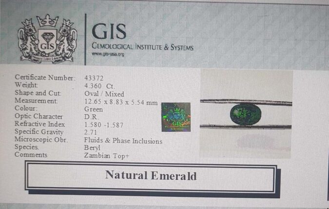 Beautiful 4.36 Ct. Emerald (Zambian Mines) Sava 4 Ratti Panna. Free Horoscope & Free Pundit Ji Advise / Consultation. Original Natural Lab certified gems by IGI GTL / Birth stones / Large Gem Selection of shree shubh Rashi Ratan Vedic dhan at Gem Mines. May Bhagwan Brahma, Vishnu, Shiv & Universe bless you.