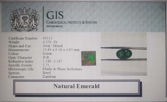 Beautiful 4.37 Ct. Emerald (Zambian Mines) Sava 4 Ratti Panna. Free Horoscope & Free Pundit Ji Advise / Consultation. Original Natural Lab certified gems by IGI GTL / Birth stones / Large Gem Selection of shree shubh Rashi Ratan Vedic dhan at Gem Mines. May Bhagwan Brahma, Vishnu, Shiv & Universe bless you.