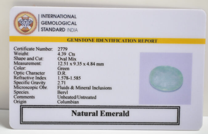 Beautiful 4.39 Cts Natural Emerald (AAA+-Mines) sva 4+ Ratti EMERALD. Free Horoscope & Free Pundit Ji Astrological Advise / Consultation. Original Natural Lab certified gems by IGI GTL / Birth stones / Large Gem Selection of shree shubh Rashi Ratan Vedic dhan at Gem Mines. May Bhagwan Brahma, Vishnu, Shiv & Universe bless you.