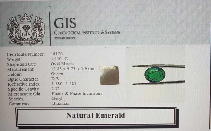 Beautiful 4.45 Ct. Emerald (Brazilian Mines) Sava 4 Ratti Panna. Free Horoscope & Free Pundit Ji Advise / Consultation. Original Natural Lab certified gems by IGI GTL / Birth stones / Large Gem Selection of shree shubh Rashi Ratan Vedic dhan at Gem Mines. May Bhagwan Brahma, Vishnu, Shiv & Universe bless you.
