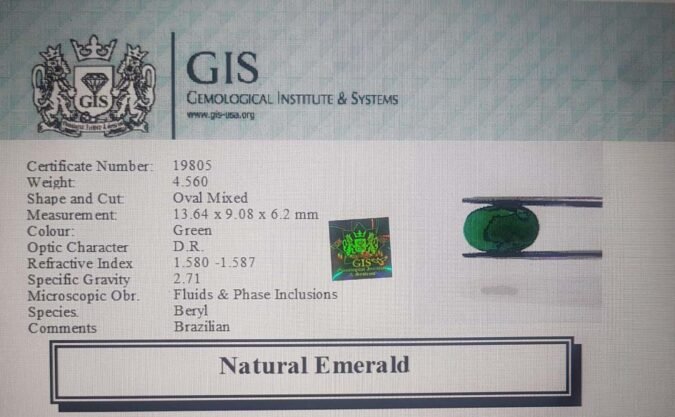 Beautiful 4.56 Ct. Emerald (Brazilian Mines) Sava 5 Ratti Panna. Free Horoscope & Free Pundit Ji Advise / Consultation. Original Natural Lab certified gems by IGI GTL / Birth stones / Large Gem Selection of shree shubh Rashi Ratan Vedic dhan at Gem Mines. May Bhagwan Brahma, Vishnu, Shiv & Universe bless you.