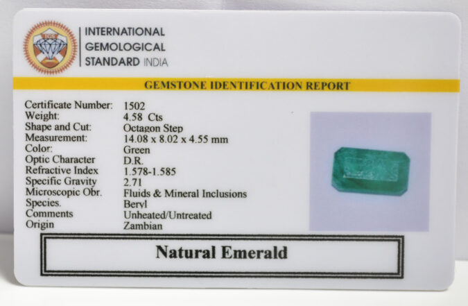 Beautiful 4.58 Cts Natural Emerald (AAA+-Mines) sva 5+ Ratti EMERALD. Free Horoscope & Free Pundit Ji Astrological Advise / Consultation. Original Natural Lab certified gems by IGI GTL / Birth stones / Large Gem Selection of shree shubh Rashi Ratan Vedic dhan at Gem Mines. May Bhagwan Brahma, Vishnu, Shiv & Universe bless you.