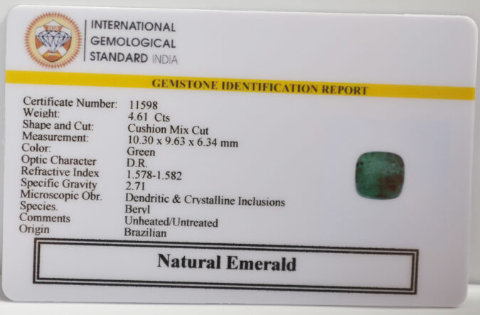 Beautiful 4.61 Cts Natural Emerald (Very Good-Mines) sva 5+ Ratti EMERALD. Free Horoscope & Free Pundit Ji Astrological Advise / Consultation. Original Natural Lab certified gems by IGI GTL / Birth stones / Large Gem Selection of shree shubh Rashi Ratan Vedic dhan at Gem Mines. May Bhagwan Brahma, Vishnu, Shiv & Universe bless you.