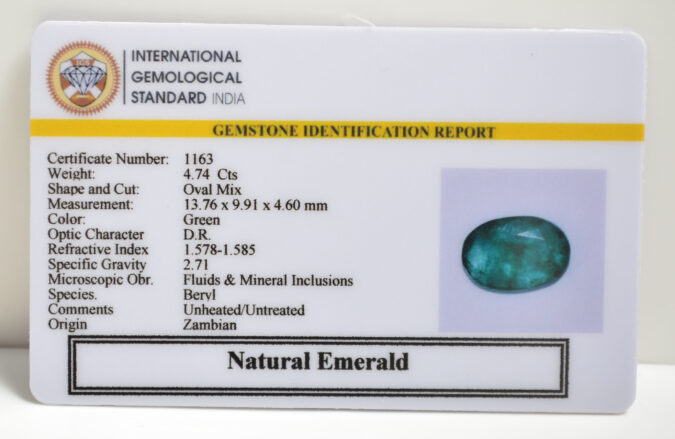 Beautiful 4.74 Cts Natural Emerald (Top-Mines) sva 5 Ratti EMERALD. Free Horoscope & Free Pundit Ji Astrological Advise / Consultation. Original Natural Lab certified gems by IGI GTL / Birth stones / Large Gem Selection of shree shubh Rashi Ratan Vedic dhan at Gem Mines. May Bhagwan Brahma, Vishnu, Shiv & Universe bless you.