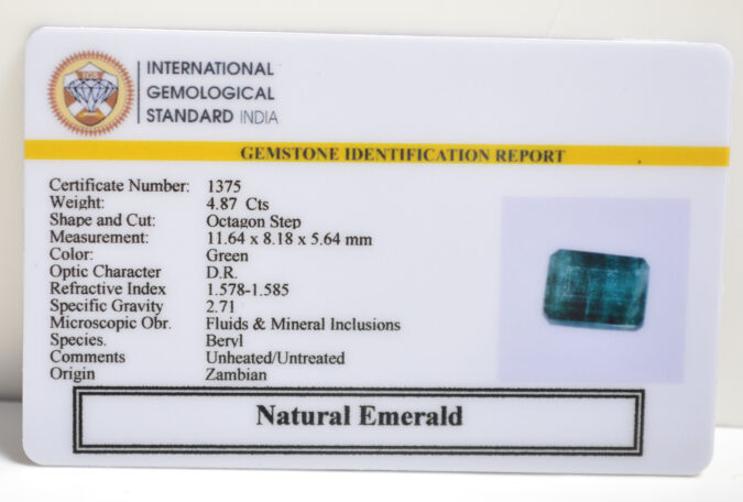 Beautiful 4.87 Cts Natural Emerald (AAA+-Mines) sva 5+ Ratti EMERALD. Free Horoscope & Free Pundit Ji Astrological Advise / Consultation. Original Natural Lab certified gems by IGI GTL / Birth stones / Large Gem Selection of shree shubh Rashi Ratan Vedic dhan at Gem Mines. May Bhagwan Brahma, Vishnu, Shiv & Universe bless you.