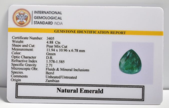 Beautiful 4.88 Cts Natural Emerald (AAA+-Mines) sva 5+ Ratti EMERALD. Free Horoscope & Free Pundit Ji Astrological Advise / Consultation. Original Natural Lab certified gems by IGI GTL / Birth stones / Large Gem Selection of shree shubh Rashi Ratan Vedic dhan at Gem Mines. May Bhagwan Brahma, Vishnu, Shiv & Universe bless you.
