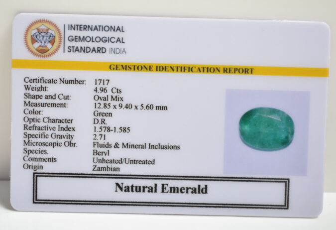 Beautiful 4.96 Cts Natural Emerald (Very Good-Mines) sva 5+ Ratti EMERALD. Free Horoscope & Free Pundit Ji Astrological Advise / Consultation. Original Natural Lab certified gems by IGI GTL / Birth stones / Large Gem Selection of shree shubh Rashi Ratan Vedic dhan at Gem Mines. May Bhagwan Brahma, Vishnu, Shiv & Universe bless you.