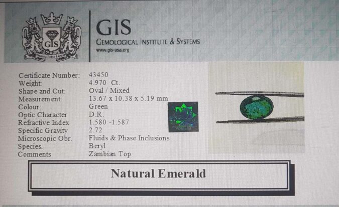 Beautiful 4.97 Ct. Emerald (Zambian Mines) Sava 5 Ratti Panna. Free Horoscope & Free Pundit Ji Advise / Consultation. Original Natural Lab certified gems by IGI GTL / Birth stones / Large Gem Selection of shree shubh Rashi Ratan Vedic dhan at Gem Mines. May Bhagwan Brahma, Vishnu, Shiv & Universe bless you.