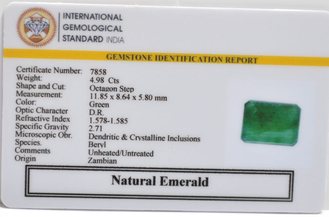 Beautiful 4.98 Cts Natural Emerald (AAA+-Mines) sva 5+ Ratti EMERALD. Free Horoscope & Free Pundit Ji Astrological Advise / Consultation. Original Natural Lab certified gems by IGI GTL / Birth stones / Large Gem Selection of shree shubh Rashi Ratan Vedic dhan at Gem Mines. May Bhagwan Brahma, Vishnu, Shiv & Universe bless you.