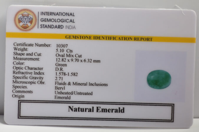 Beautiful 5.1 Ct. Natural Emerald (AAA-Mines) sva 5+ Ratti Panna. Free Horoscope & Free Pundit Ji Astrological Advise / Consultation. Original Natural Lab certified gems by IGI GTL / Birth stones / Large Gem Selection of shree shubh Rashi Ratan Vedic dhan at Gem Mines. May Bhagwan Brahma, Vishnu, Shiv & Universe bless you.