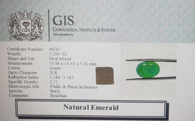 Beautiful 5.1 Ct. Emerald (Brazilian Mines) Sava 5 Ratti Panna. Free Horoscope & Free Pundit Ji Advise / Consultation. Original Natural Lab certified gems by IGI GTL / Birth stones / Large Gem Selection of shree shubh Rashi Ratan Vedic dhan at Gem Mines. May Bhagwan Brahma, Vishnu, Shiv & Universe bless you.