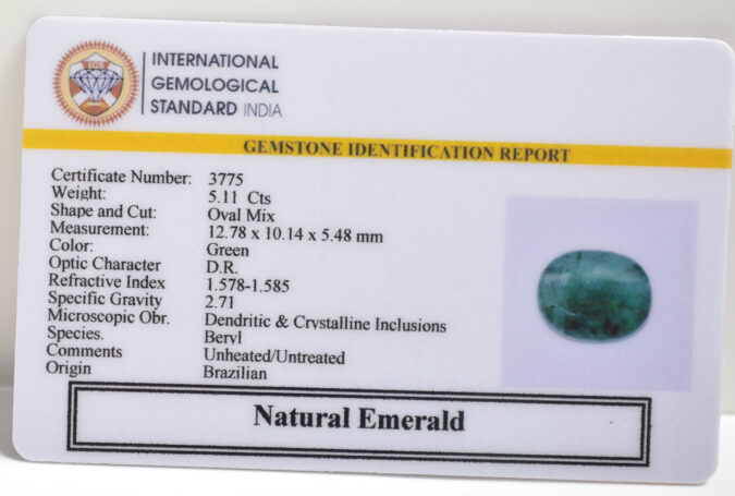 Beautiful 5.11 Cts Natural Emerald (Very Good-Mines) sva 5+ Ratti EMERALD. Free Horoscope & Free Pundit Ji Astrological Advise / Consultation. Original Natural Lab certified gems by IGI GTL / Birth stones / Large Gem Selection of shree shubh Rashi Ratan Vedic dhan at Gem Mines. May Bhagwan Brahma, Vishnu, Shiv & Universe bless you.