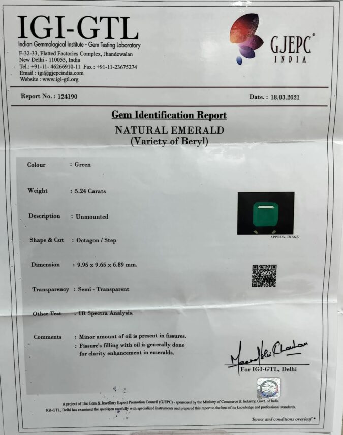 Beautiful 5.24 Ct. Natural Emerald (Top+-Mines) sva 5+ Ratti Panna. Free Horoscope & Free Pundit Ji Astrological Advise / Consultation. Original Natural Lab certified gems by IGI GTL / Birth stones / Large Gem Selection of shree shubh Rashi Ratan Vedic dhan at Gem Mines. May Bhagwan Brahma, Vishnu, Shiv & Universe bless you.