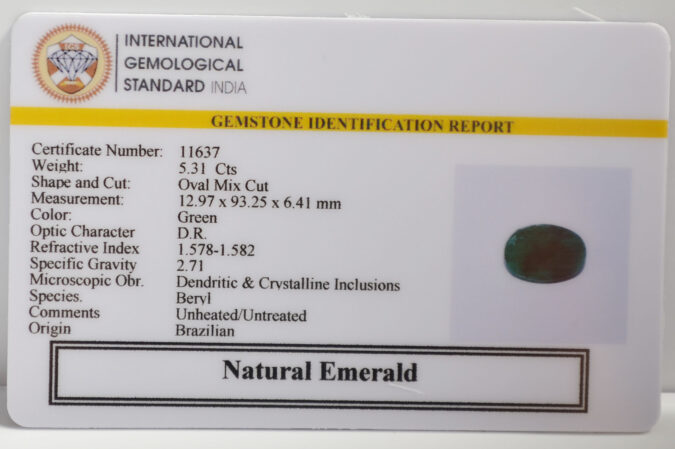 Beautiful 5.31 Cts Natural Emerald (AAA-Mines) sva 5+ Ratti EMERALD. Free Horoscope & Free Pundit Ji Astrological Advise / Consultation. Original Natural Lab certified gems by IGI GTL / Birth stones / Large Gem Selection of shree shubh Rashi Ratan Vedic dhan at Gem Mines. May Bhagwan Brahma, Vishnu, Shiv & Universe bless you.