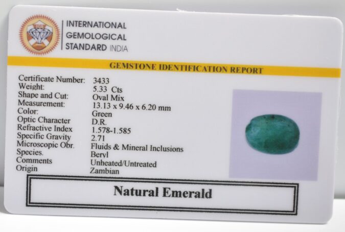 Beautiful 5.33 Cts Natural Emerald (AAA-Mines) sva 5+ Ratti EMERALD. Free Horoscope & Free Pundit Ji Astrological Advise / Consultation. Original Natural Lab certified gems by IGI GTL / Birth stones / Large Gem Selection of shree shubh Rashi Ratan Vedic dhan at Gem Mines. May Bhagwan Brahma, Vishnu, Shiv & Universe bless you.