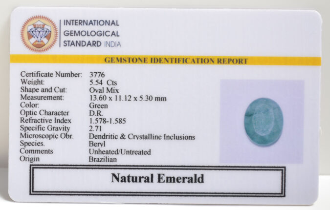 Beautiful 5.54 Cts Natural Emerald (Very Good-Mines) sva 6+ Ratti EMERALD. Free Horoscope & Free Pundit Ji Astrological Advise / Consultation. Original Natural Lab certified gems by IGI GTL / Birth stones / Large Gem Selection of shree shubh Rashi Ratan Vedic dhan at Gem Mines. May Bhagwan Brahma, Vishnu, Shiv & Universe bless you.