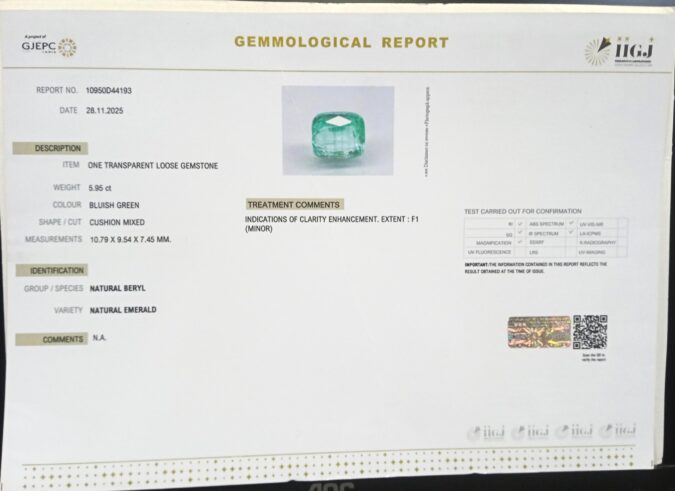 Beautiful 5.95 Cts Natural Emerald (Top-Mines) sva 6+ Ratti EMERALD. Free Horoscope & Free Pundit Ji Astrological Advise / Consultation. Original Natural Lab certified gems by IGI GTL / Birth stones / Large Gem Selection of shree shubh Rashi Ratan Vedic dhan at Gem Mines. May Bhagwan Brahma, Vishnu, Shiv & Universe bless you.