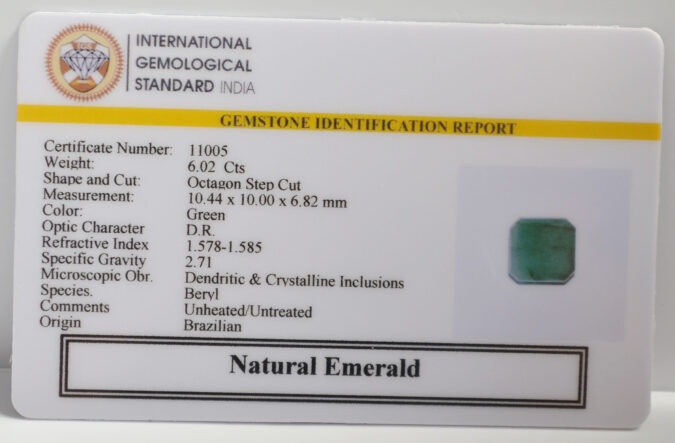 Beautiful 6.02 Cts Natural Emerald (Very Good-Mines) sva 6+ Ratti EMERALD. Free Horoscope & Free Pundit Ji Astrological Advise / Consultation. Original Natural Lab certified gems by IGI GTL / Birth stones / Large Gem Selection of shree shubh Rashi Ratan Vedic dhan at Gem Mines. May Bhagwan Brahma, Vishnu, Shiv & Universe bless you.