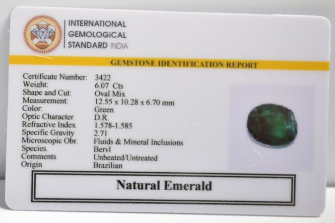 Beautiful 6.07 Cts Natural Emerald (Very Good-Mines) sva 6+ Ratti EMERALD. Free Horoscope & Free Pundit Ji Astrological Advise / Consultation. Original Natural Lab certified gems by IGI GTL / Birth stones / Large Gem Selection of shree shubh Rashi Ratan Vedic dhan at Gem Mines. May Bhagwan Brahma, Vishnu, Shiv & Universe bless you.