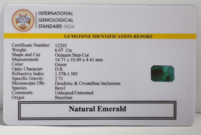 Beautiful 6.07 Cts Natural Emerald (Very Good-Mines) sva 6+ Ratti EMERALD. Free Horoscope & Free Pundit Ji Astrological Advise / Consultation. Original Natural Lab certified gems by IGI GTL / Birth stones / Large Gem Selection of shree shubh Rashi Ratan Vedic dhan at Gem Mines. May Bhagwan Brahma, Vishnu, Shiv & Universe bless you.