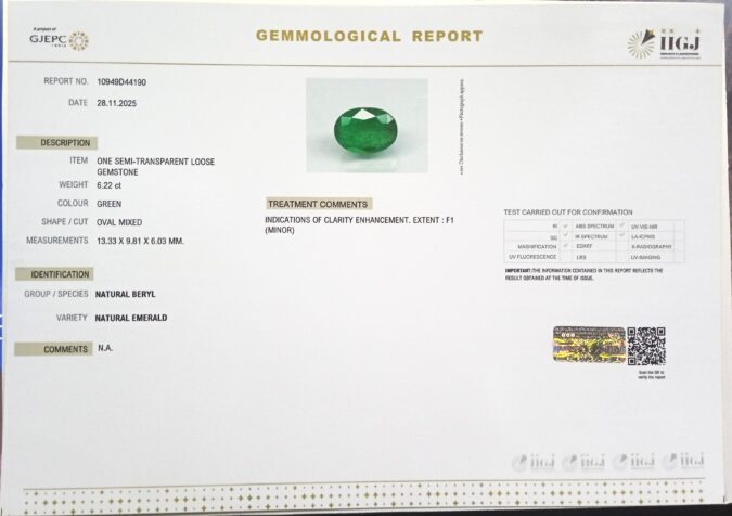 Beautiful 6.22 Cts Natural Emerald (Top++-Mines) sva 6+ Ratti EMERALD. Free Horoscope & Free Pundit Ji Astrological Advise / Consultation. Original Natural Lab certified gems by IGI GTL / Birth stones / Large Gem Selection of shree shubh Rashi Ratan Vedic dhan at Gem Mines. May Bhagwan Brahma, Vishnu, Shiv & Universe bless you.