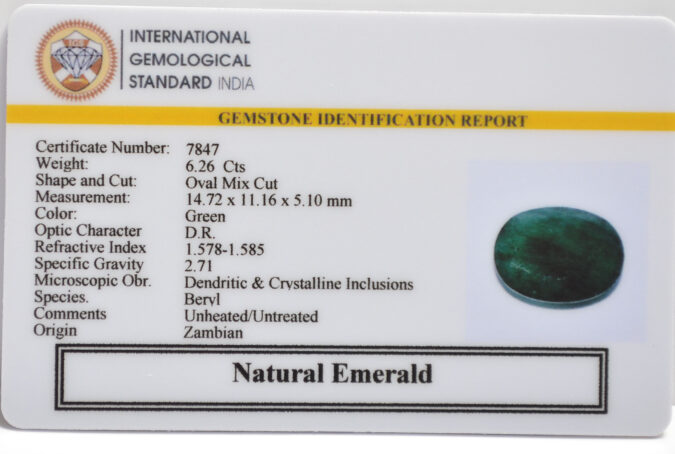 Beautiful 6.26 Cts Natural Emerald (AAA+-Mines) sva 6+ Ratti EMERALD. Free Horoscope & Free Pundit Ji Astrological Advise / Consultation. Original Natural Lab certified gems by IGI GTL / Birth stones / Large Gem Selection of shree shubh Rashi Ratan Vedic dhan at Gem Mines. May Bhagwan Brahma, Vishnu, Shiv & Universe bless you.