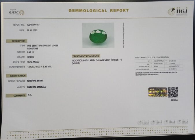 Beautiful 6.42 Cts Natural Emerald (Top-Mines) sva 7+ Ratti EMERALD. Free Horoscope & Free Pundit Ji Astrological Advise / Consultation. Original Natural Lab certified gems by IGI GTL / Birth stones / Large Gem Selection of shree shubh Rashi Ratan Vedic dhan at Gem Mines. May Bhagwan Brahma, Vishnu, Shiv & Universe bless you.