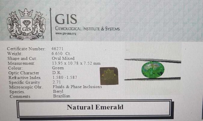 Beautiful 6.65 Ct. Emerald (Brazilian Mines) Sava 7 Ratti Panna. Free Horoscope & Free Pundit Ji Advise / Consultation. Original Natural Lab certified gems by IGI GTL / Birth stones / Large Gem Selection of shree shubh Rashi Ratan Vedic dhan at Gem Mines. May Bhagwan Brahma, Vishnu, Shiv & Universe bless you.