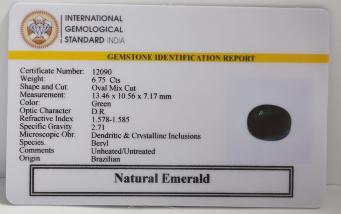 Beautiful 6.75 Cts Natural Emerald (Very Good-Mines) sva 7+ Ratti EMERALD. Free Horoscope & Free Pundit Ji Astrological Advise / Consultation. Original Natural Lab certified gems by IGI GTL / Birth stones / Large Gem Selection of shree shubh Rashi Ratan Vedic dhan at Gem Mines. May Bhagwan Brahma, Vishnu, Shiv & Universe bless you.