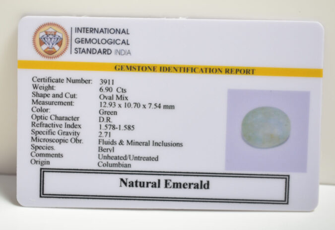 Beautiful 6.9 Cts Natural Emerald (AAA-Mines) sva 7+ Ratti EMERALD. Free Horoscope & Free Pundit Ji Astrological Advise / Consultation. Original Natural Lab certified gems by IGI GTL / Birth stones / Large Gem Selection of shree shubh Rashi Ratan Vedic dhan at Gem Mines. May Bhagwan Brahma, Vishnu, Shiv & Universe bless you.