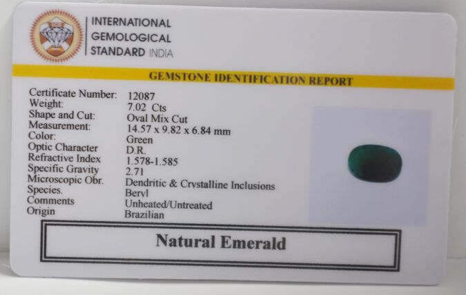 Beautiful 7.02 Cts Natural Emerald (Very Good-Mines) sva 7+ Ratti EMERALD. Free Horoscope & Free Pundit Ji Astrological Advise / Consultation. Original Natural Lab certified gems by IGI GTL / Birth stones / Large Gem Selection of shree shubh Rashi Ratan Vedic dhan at Gem Mines. May Bhagwan Brahma, Vishnu, Shiv & Universe bless you.