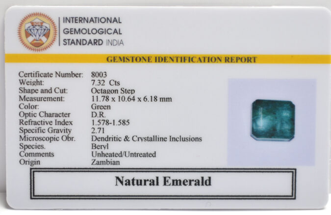 Beautiful 7.32 Cts Natural Emerald (AAA+-Mines) sva 8+ Ratti EMERALD. Free Horoscope & Free Pundit Ji Astrological Advise / Consultation. Original Natural Lab certified gems by IGI GTL / Birth stones / Large Gem Selection of shree shubh Rashi Ratan Vedic dhan at Gem Mines. May Bhagwan Brahma, Vishnu, Shiv & Universe bless you.