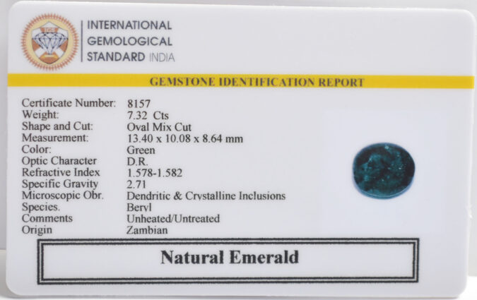 Beautiful 7.32 Cts Natural Emerald (AAA+-Mines) sva 8+ Ratti EMERALD. Free Horoscope & Free Pundit Ji Astrological Advise / Consultation. Original Natural Lab certified gems by IGI GTL / Birth stones / Large Gem Selection of shree shubh Rashi Ratan Vedic dhan at Gem Mines. May Bhagwan Brahma, Vishnu, Shiv & Universe bless you.