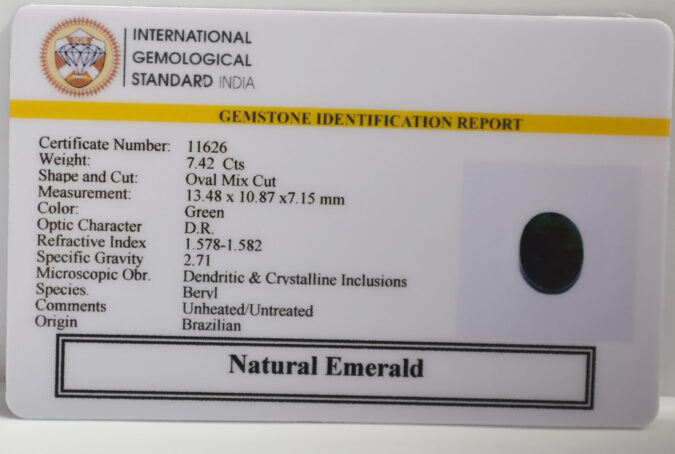 Beautiful 7.42 Cts Natural Emerald (Very Good-Mines) sva 8+ Ratti EMERALD. Free Horoscope & Free Pundit Ji Astrological Advise / Consultation. Original Natural Lab certified gems by IGI GTL / Birth stones / Large Gem Selection of shree shubh Rashi Ratan Vedic dhan at Gem Mines. May Bhagwan Brahma, Vishnu, Shiv & Universe bless you.