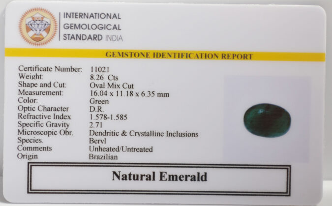 Beautiful 8.26 Cts Natural Emerald (Very Good-Mines) sva 9+ Ratti EMERALD. Free Horoscope & Free Pundit Ji Astrological Advise / Consultation. Original Natural Lab certified gems by IGI GTL / Birth stones / Large Gem Selection of shree shubh Rashi Ratan Vedic dhan at Gem Mines. May Bhagwan Brahma, Vishnu, Shiv & Universe bless you.